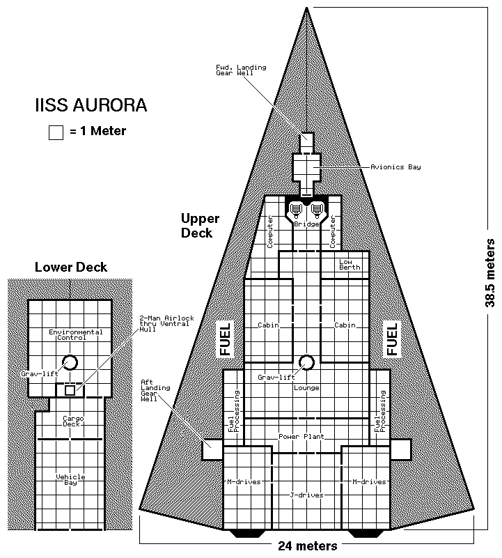 | Accom: | Crew=2 (Bridge/Engineer=1, Gunner=1), Passengers=3, Stateroom*2, Low Berth, SubCraft=007 Speeder (4t) | ||||||